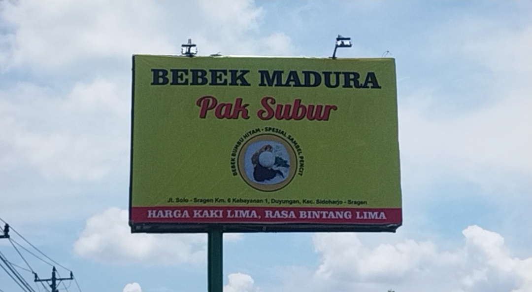 SRAGEN, SINDOSOLO.NEWS – Satu lagi Menu Kuliner yang mungkin bisa menjadi Alternatif para penggemar Kuliner yang berada di Solo Raya Jateng. Adalah Bebek Madura Pak Subur, “Harga Kaki Lima Rasa Bintang Lima” Kuliner Bebek Goreng Resep Asli dari Madura tentunya memiliki cita rasa tersendiri yang patut untuk dicoba dan dinikmati. Disamping menu masakan istimewa yang berselera Bebek Madura Pak Subur juga menawarkan kenyamanan lain dengan nuansa sensasi berbeda yang membuat jadi alasan pengunjung untuk kembali singgah yaitu tempat yang nyaman, parkir yang luas, tersedia gazebo – gazebo untuk Healing, ruang meeting, Mushola dan Free Wifi. Berlokasi di jalan Solo -Sragen Km 6 Kebayanan 3, Duyungan, Kecamatan Sidoharjo, Sragen. Bebek Madura Pak Subur, “Harga Kaki Lima Rasa Bintang Lima” Pantas untuk dicoba dan Silahkan untuk datang, singgah dan menikmati.