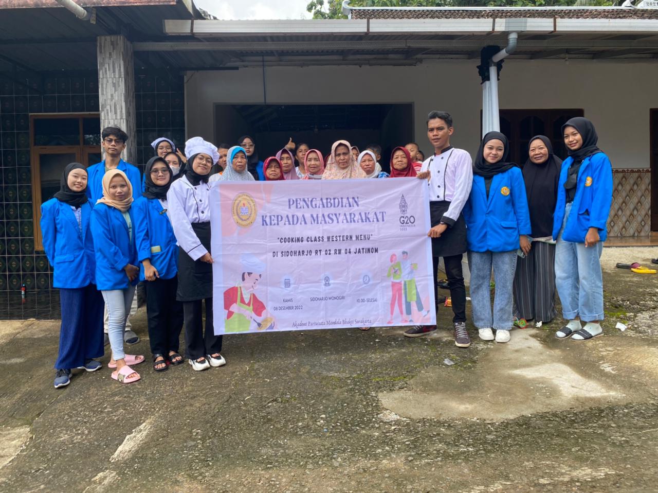 SURAKARTA, SINDOSOLO.NEWS – Dalam rangka menyambut hari ibu 22 Desember 2022, mahasiswa-mahasiswi Akademi Pariwisata Mandala Bhakti Surakarta (AKPARTA) di bawah bimbingan Dosen, Ibu Erna Wigati,.S.Pd,.M.Pd mengadakan program cooking class western menu yang diselenggarakan hari Kamis, 8 Desember 2022 di Dusun Wates Rt.002 Rw.004, Kelurahan Jatinom, Kecamatan Sidoharjo, Kabupaten Wonogiri, Jawa Tengah. Kegiatan pengabdian kepada masyarakat ini dilakukan oleh mahasiswa-mahasiswi AMBS dalam rangka project mata kuliah Public Relation, dan juga mewujudkan visi misi Akademi Pariwisata Madala Bhakti Surakarta (AKPARTA).