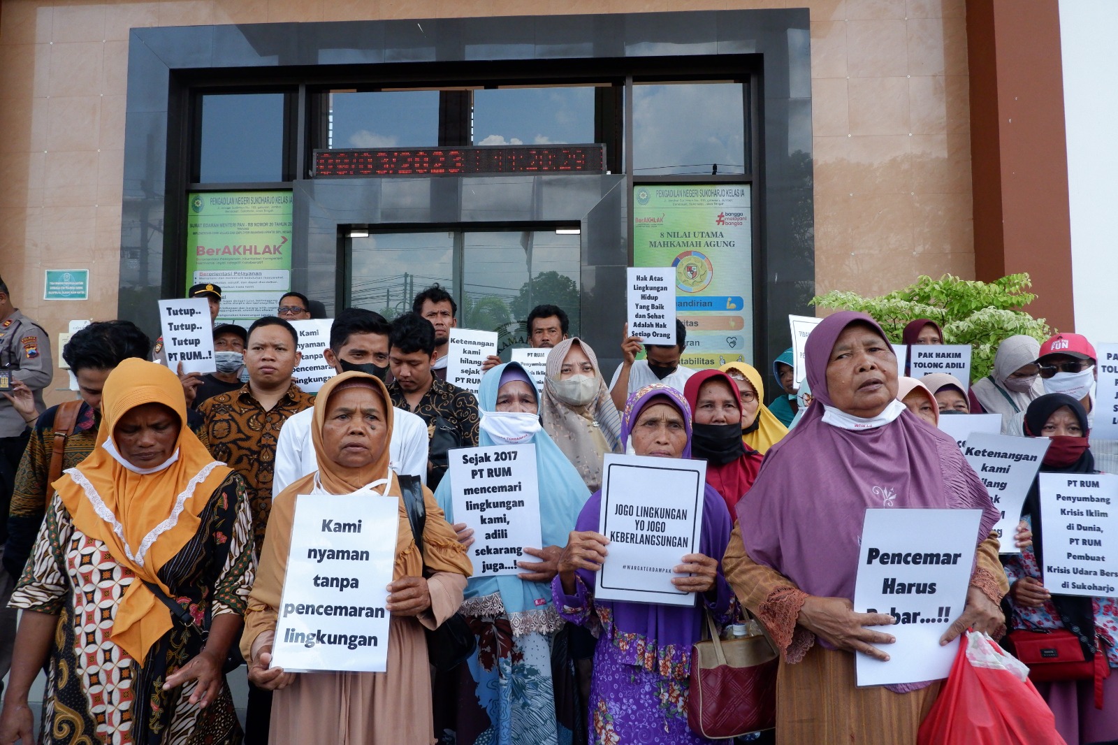 SUKOHARJO, SINDOSOLO.NEWS – Puluhan warga Sukoharjo dengan didukung mahasiswa Solo raya pada mendatangi Pengadilan Negeri Sukoharjo (PN Sukoharjo) Kamis, 9 Maret 2023, untuk mendaftarkan Gugatan Perwakilan Kelompok (class action) dengan tergugat yaitu PT Rayon Utama Makmur (PT RUM). Gugatan ini diajukan atas Perbuatan Melawan Hukum (PMH) yang dilakukan oleh PT RUM karena telah menghasilkan bau busuk serta pencemaran lingkungan sejak awal beroperasi pada 2017 sampai sekarang.