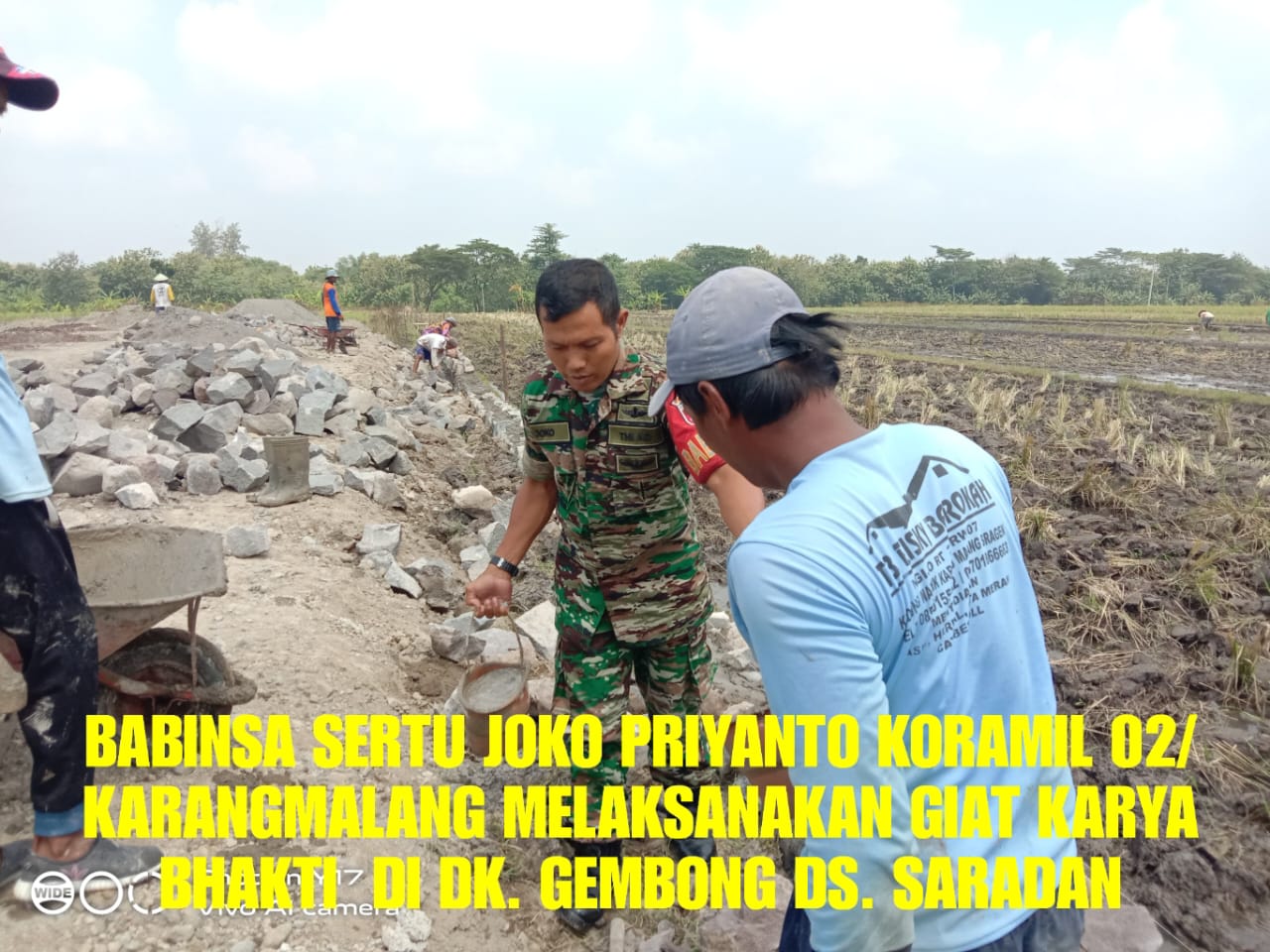 SRAGEN, SINDOSOLO.NEWS – Babinsa Desa Saradan Sertu Joko Priyanto Koramil 02/Karangmalang Kodim 0725/Sragen melaksanakan giat membantu kerja bakti pengerjaan talud irigasi persawahan di Dk. Gembong RT. 04 Desa Saradan Kec. Karangmalang, Jum’at (24/03/2023)