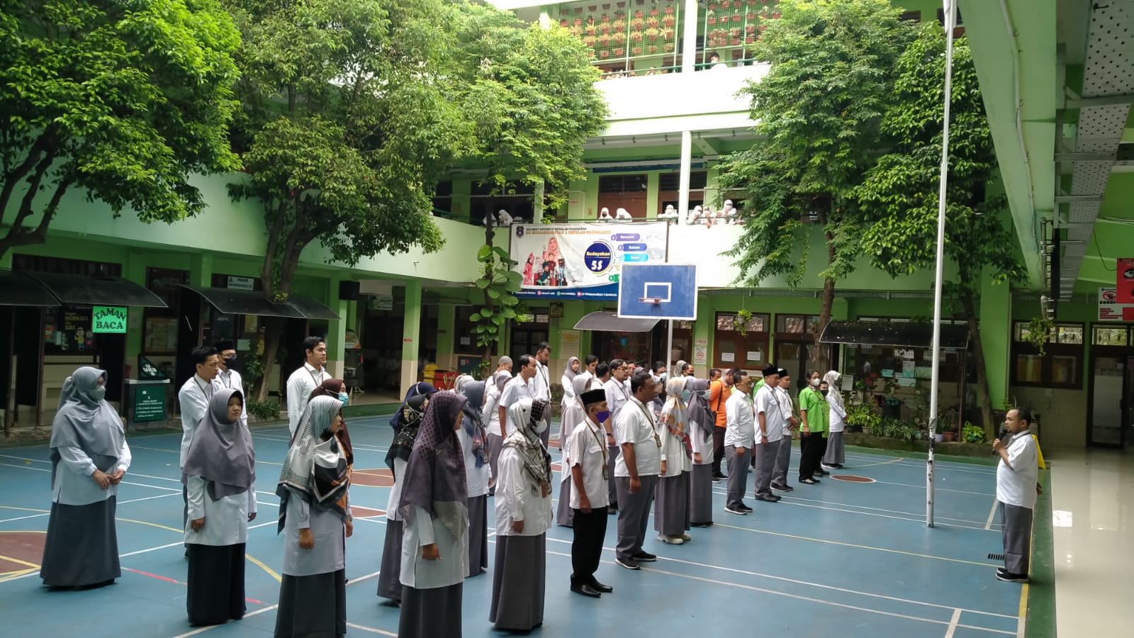SOLO, SINDOSOLO.NEWS – Guru Karyawan Sekolah Pengegrak SD Muhammadiyah 1 Ketelan Surakarta, berkumpumpul dan berbaris sesuai instruksi Kepala Sekolah Penggerak Hj Sri Sayekti MPd di halaman sekolah guna habituasi apel pagi dan budaya disiplin.