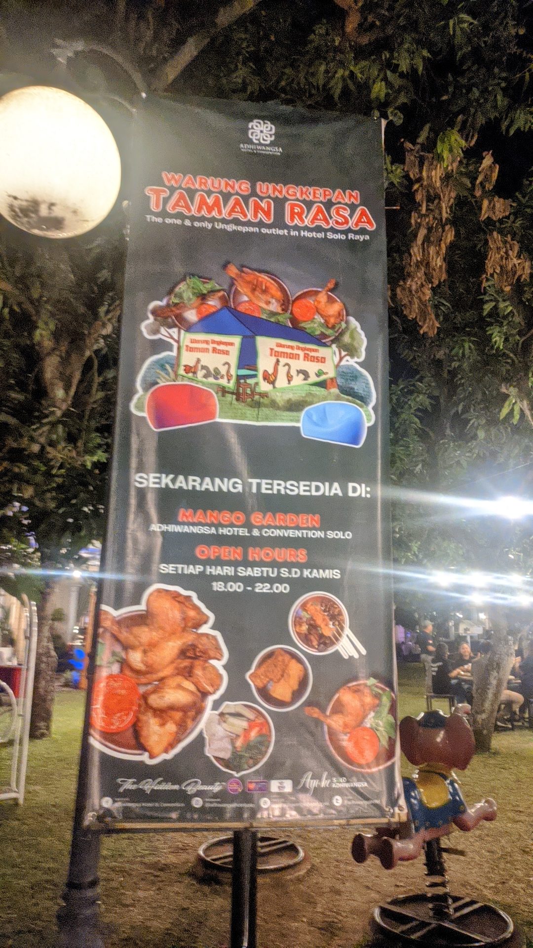 “Kami membuka outlet baru “Warung Ungkepan Taman Rasa” berharap dapat menjadi tempat yang ideal untuk bersantap keluarga, reuni teman, atau bahkan acara perayaan. Dengan menyajikan menu yang sangat familiar namun kita kemas dengan elegan. Outlet ini buka setiap hari, kecuali pada hari Jumat, mulai pukul 19.00 WIB sampai selesai di area mango garden. Dengan harga terjangkau dan pilihan menu yang beragam” ujar Mahadewi Lourdes, Public Relation Adhiwangsa Hotel & Convention Solo