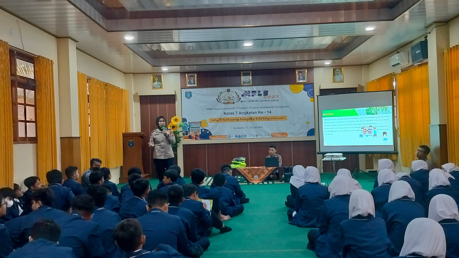 AKP Winarsih, S.H, M.H beserta tim Polresta Kota Surakarta memberikan pelatihan kedisiplinan dan edukasi anti bullying kepada para siswa pada Selasa (18/07/2023). Pelatihan PBB (Peraturan Baris Berbaris) guna menanamkan kebiasaan dalam tata cara kehidupan yang diarahkan kepada terbentuknya suatu perwatakan yang disiplin. Selain itu, para siswa diajak menyimak bentuk-bentuk bullying dalam tayangan video. Para siswa diajarkan tentang pengertian dan dampak bullying dalam kehidupan sehari-hari.