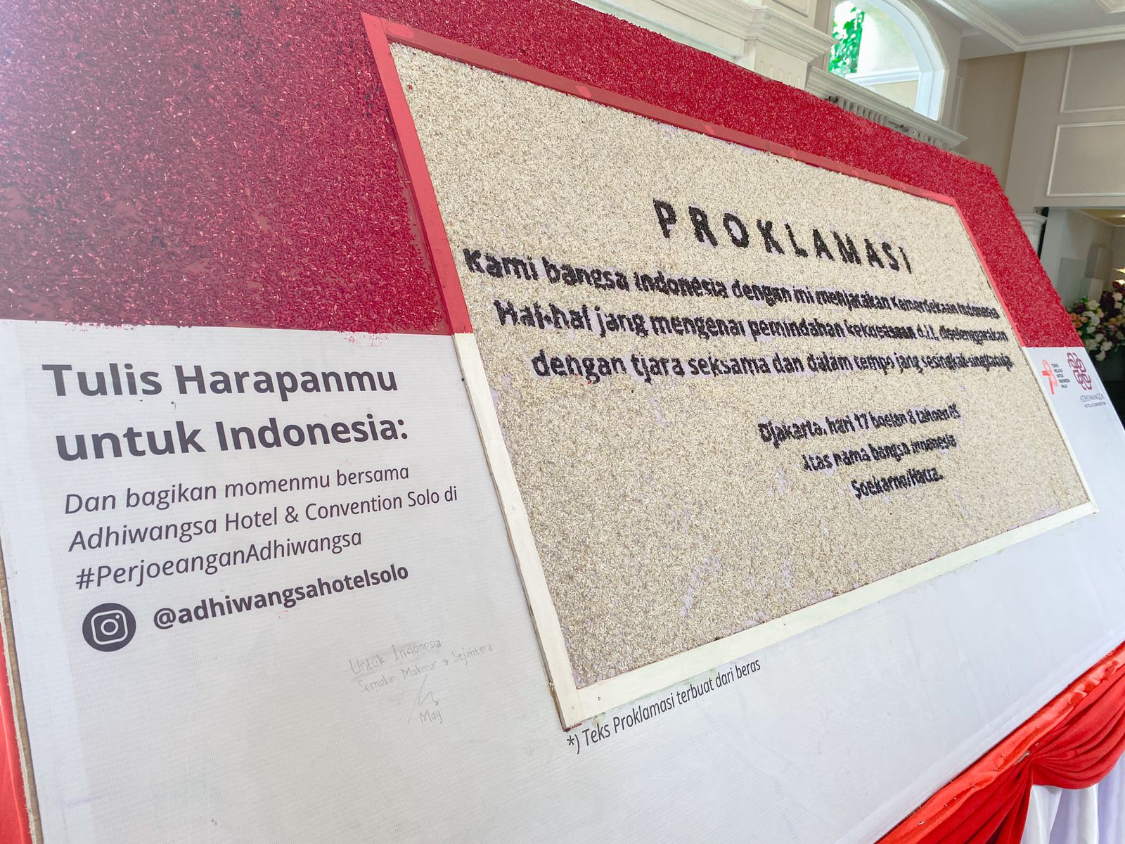 “Tamu hotel dapat melihat dan menuliskan harapannya sendiri pada naskah proklamasi yang dihiasi oleh setiap butir beras di Area Lobby utama Adhiwangsa Hotel & Convention Solo. Berlangsung mulai dari tanggal 1 hingga 30 Agustus 2023, Adhiwangsa Hotel & Convention Solo berkomitmen untuk memberikan pengalaman menginap yang nyaman dan layanan terbaik bagi para tamu yang ingin merayakan momen bersejarah ini.” Ujar Mahadewi Lourdes, Public Relation Adhiwangsa Hotel & Convention Solo
